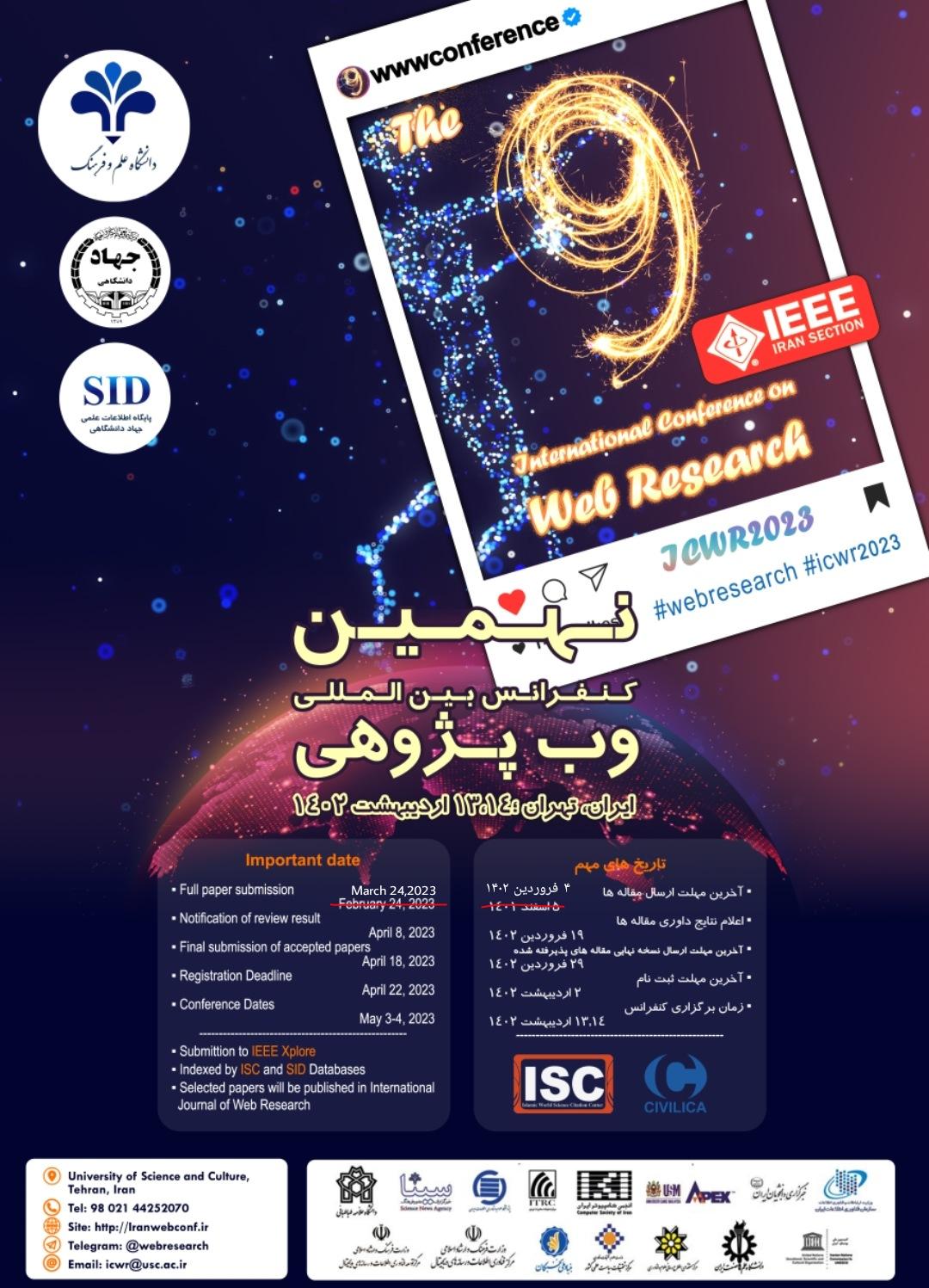 The conference will be held on 3-4 May , 2023; Tehran, Iran. Web Research is a multidisciplinary field with strong ties among Computer, Information, Library and communication sciences. The conference is jointly organized by the University of Science and Culture (USC) and the Academic Center for Education, Culture and Research (ACECR).